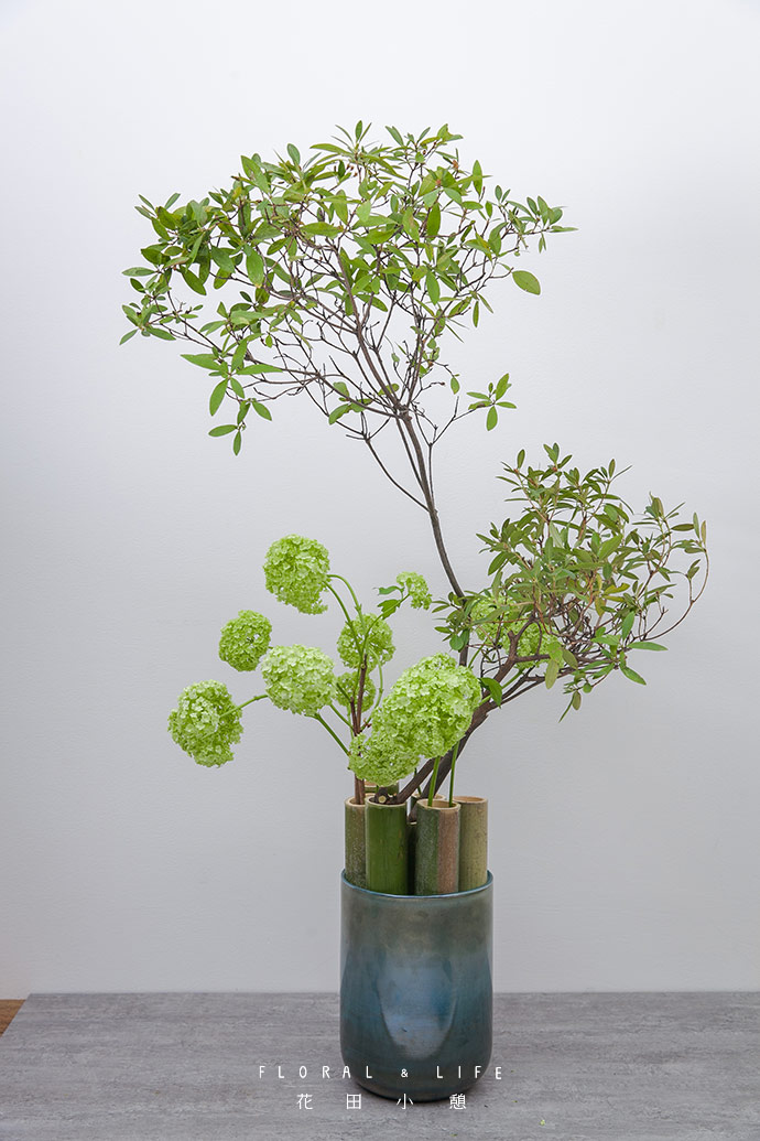 将绣球散落式插入竹筒里,绣球枝条自然伸展,延伸了作品的线条。
