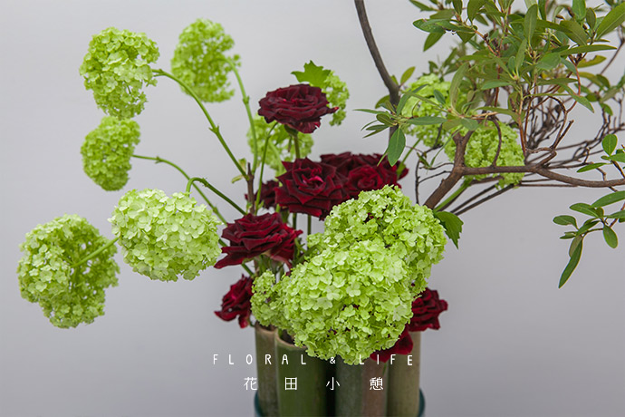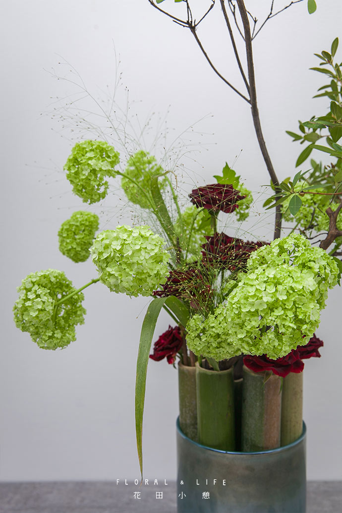 将红色的玫瑰点缀插入竹筒里,鲜艳的红色与绣球的嫩绿色形成强烈对比。高低错落,丰富作品层次。