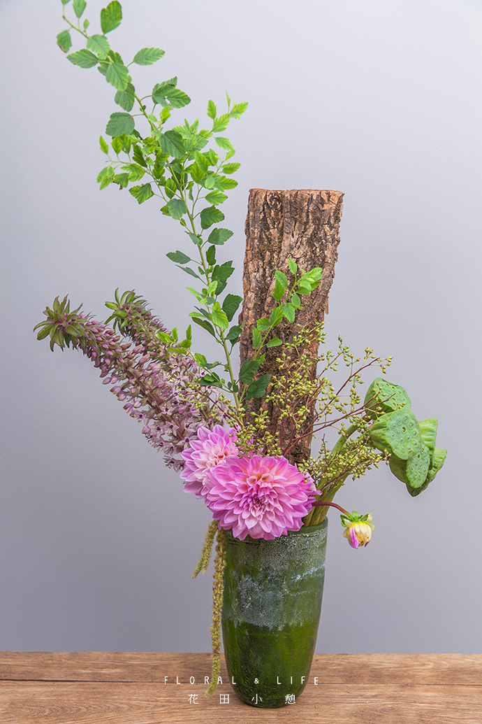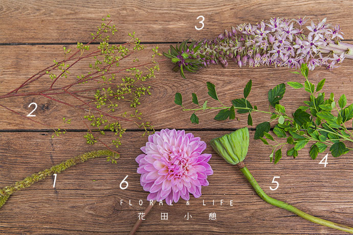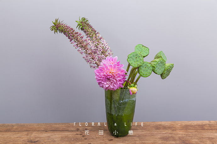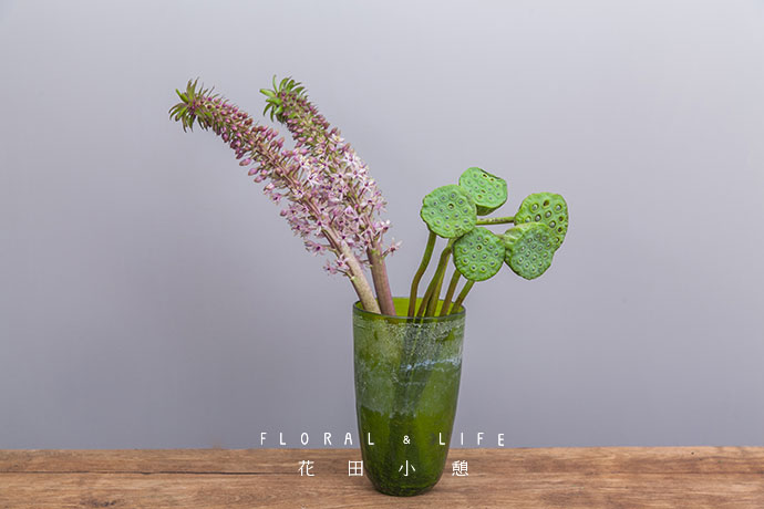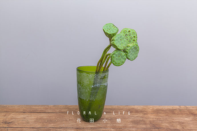 为了方便大家在花材搭配时的选择,花田小憩特设香味等级图谱,供大家在学习过程中了解更多植物的属性,以方便作品选择更适合的空间位置陈列。将多支莲蓬插入花器内,靠于一侧。