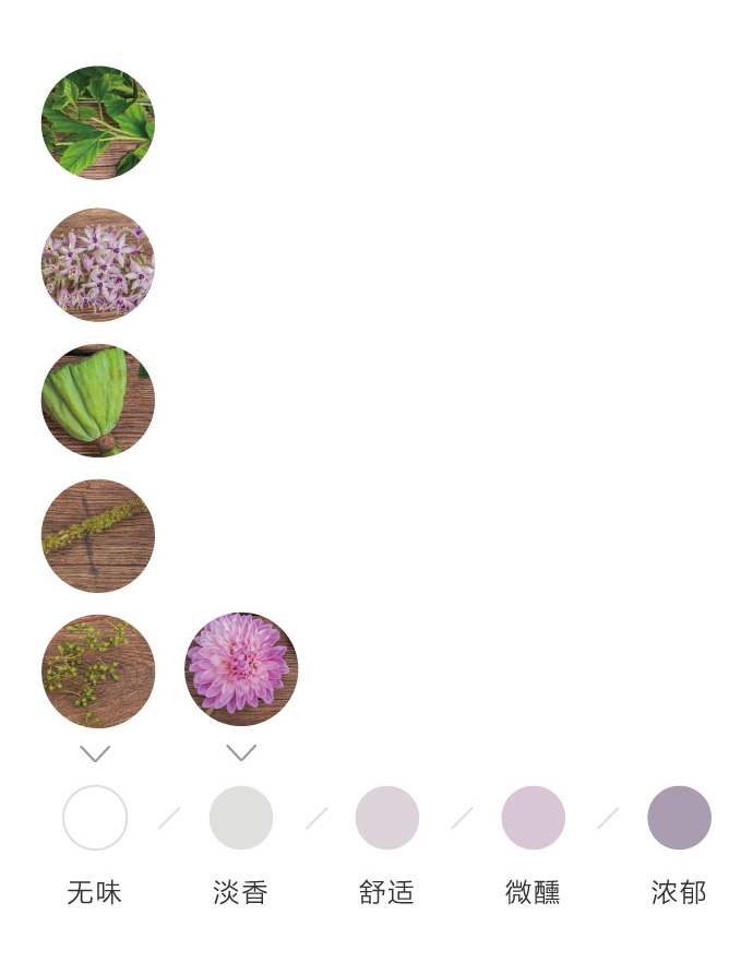 为了方便大家在花材搭配时的选择,花田小憩特设香味等级图谱,供大家在学习过程中了解更多植物的属性,以方便作品选择更适合的空间位置陈列。