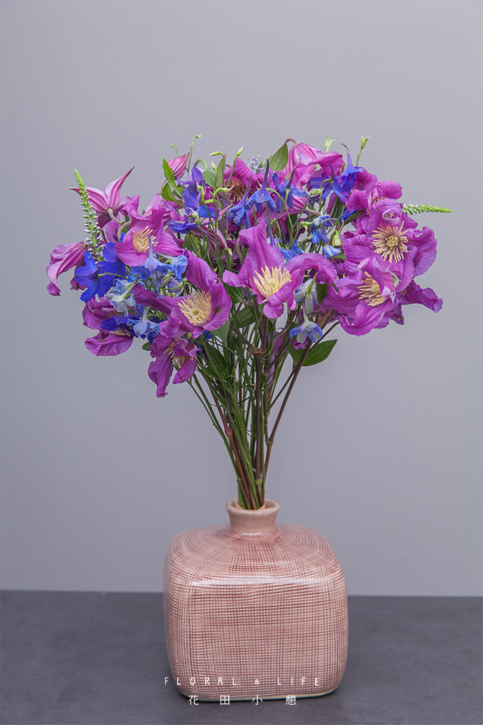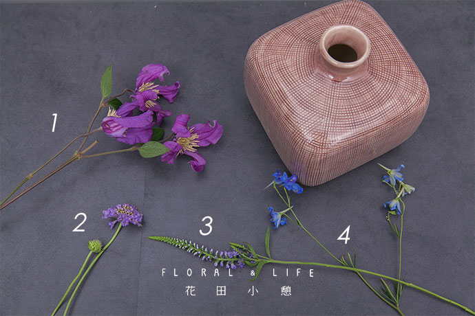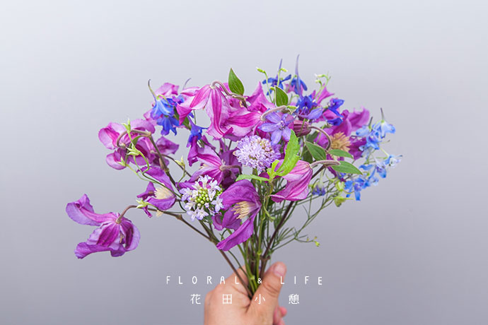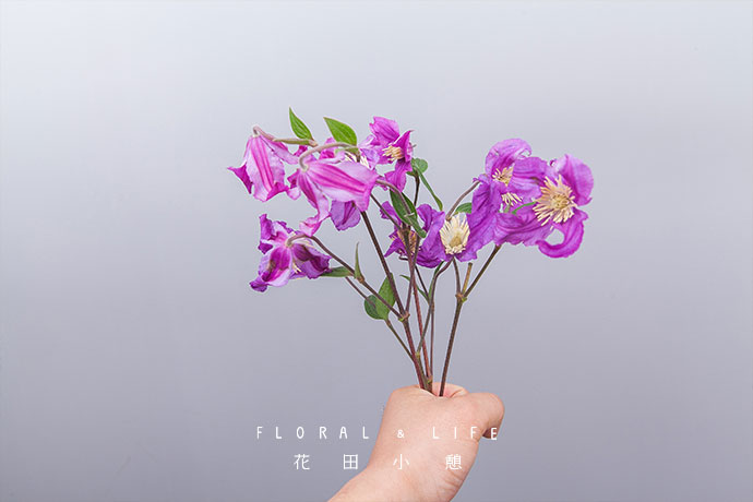 为了方便大家在花材搭配时的选择,花田小憩特设香味等级图谱,供大家在学习过程中了解更多植物的属性,以方便作品选择更适合的空间位置陈列。将多支铁线莲握于手中,作为作品的主花。