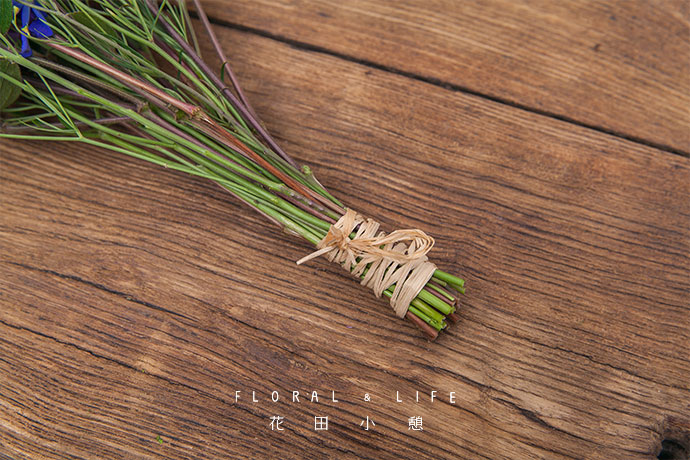 用拉菲草将花束底部一小段绑紧,如果固定位置太靠上会使花束变得紧凑而不自然。