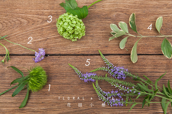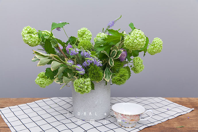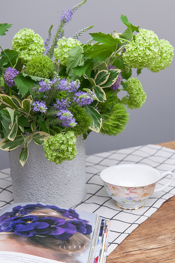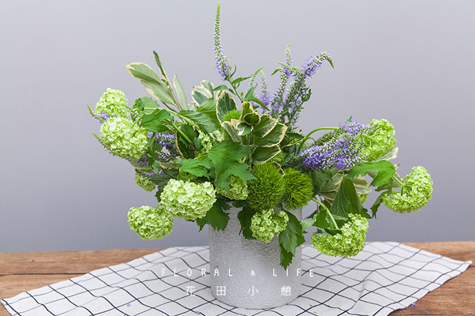 立秋过后仍有一伏,天气依然有些闷热。假期将至,不如用大量绿色花材为家打造一份清凉与活力,加入些许紫色小花,更添亲近、宁静之感。