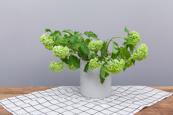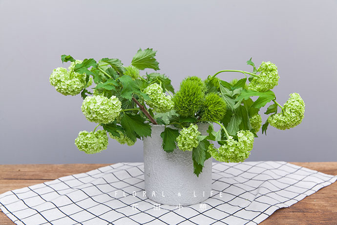 为了方便大家在花材搭配时的选择,花田小憩特设香味等级图谱,供大家在学习过程中了解更多植物的属性,以方便作品选择更适合的空间位置陈列。将木绣球插入花瓶中,均匀分布,木绣球枝条弯曲,呈现自然气息。