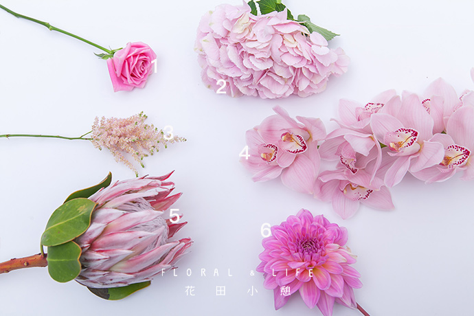 加入粉色绣球,绣球花头娇弱,小心别伤到花头。