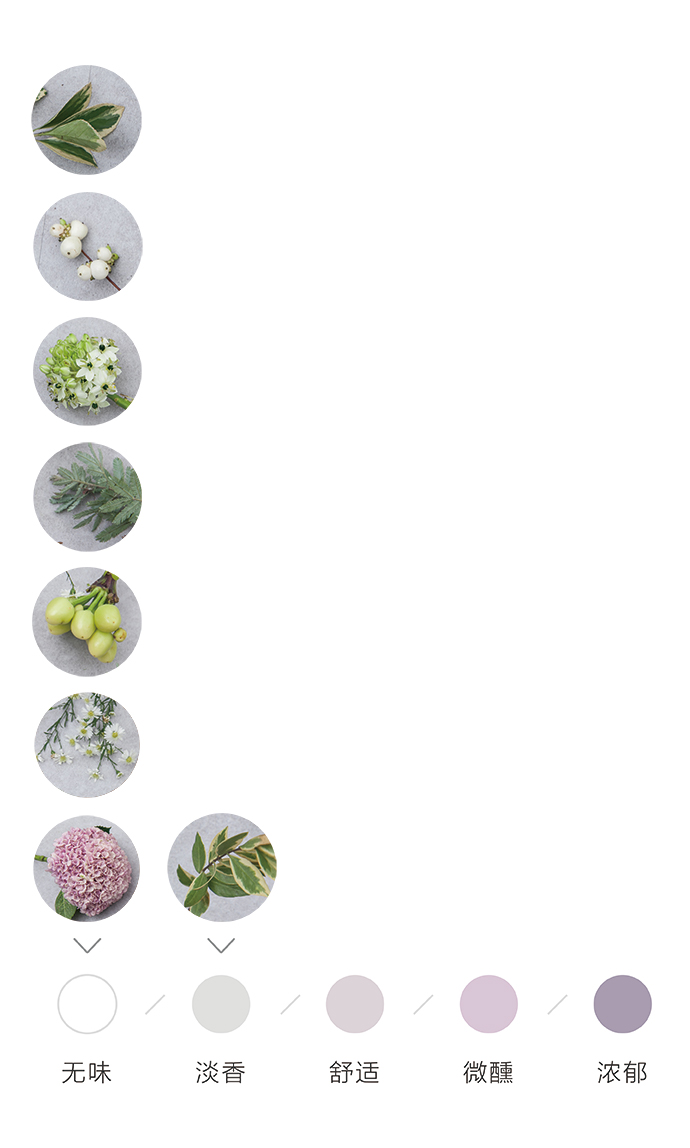 为了方便大家在花材搭配时的选择,花田小憩APP特设香味等级图谱,供大家在学习过程中了解更多植物的属性,以方便作品选择更适合的空间位置陈列。