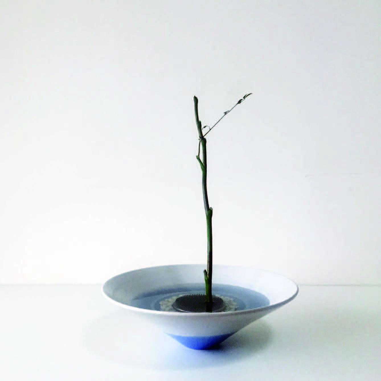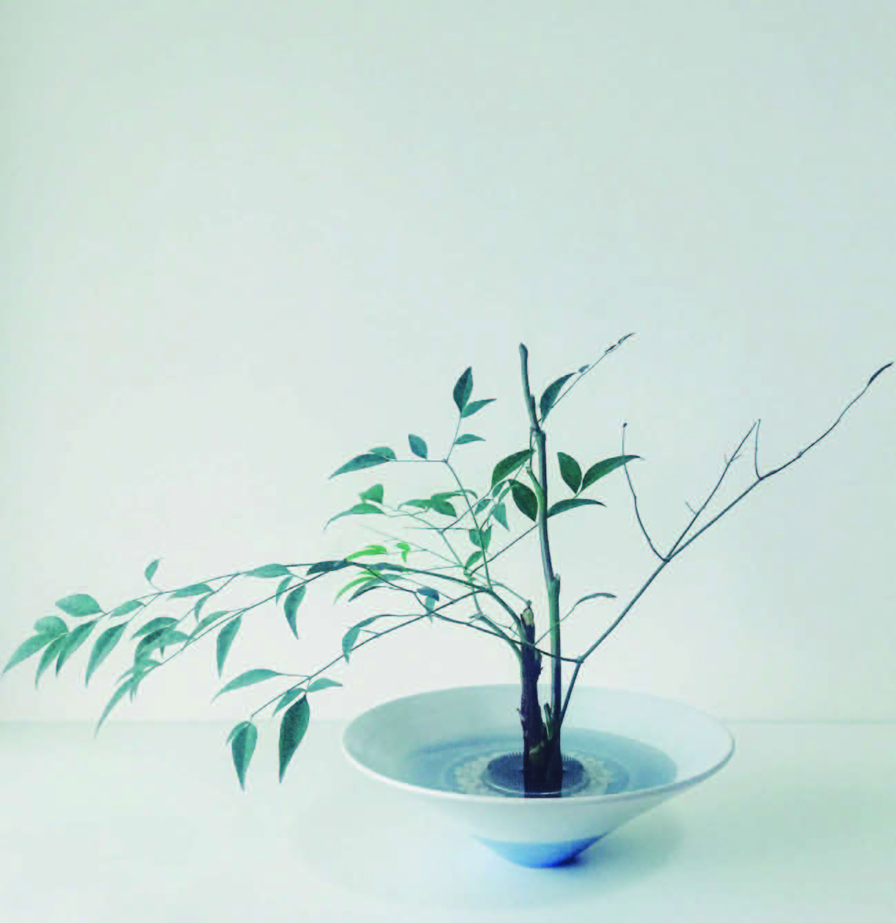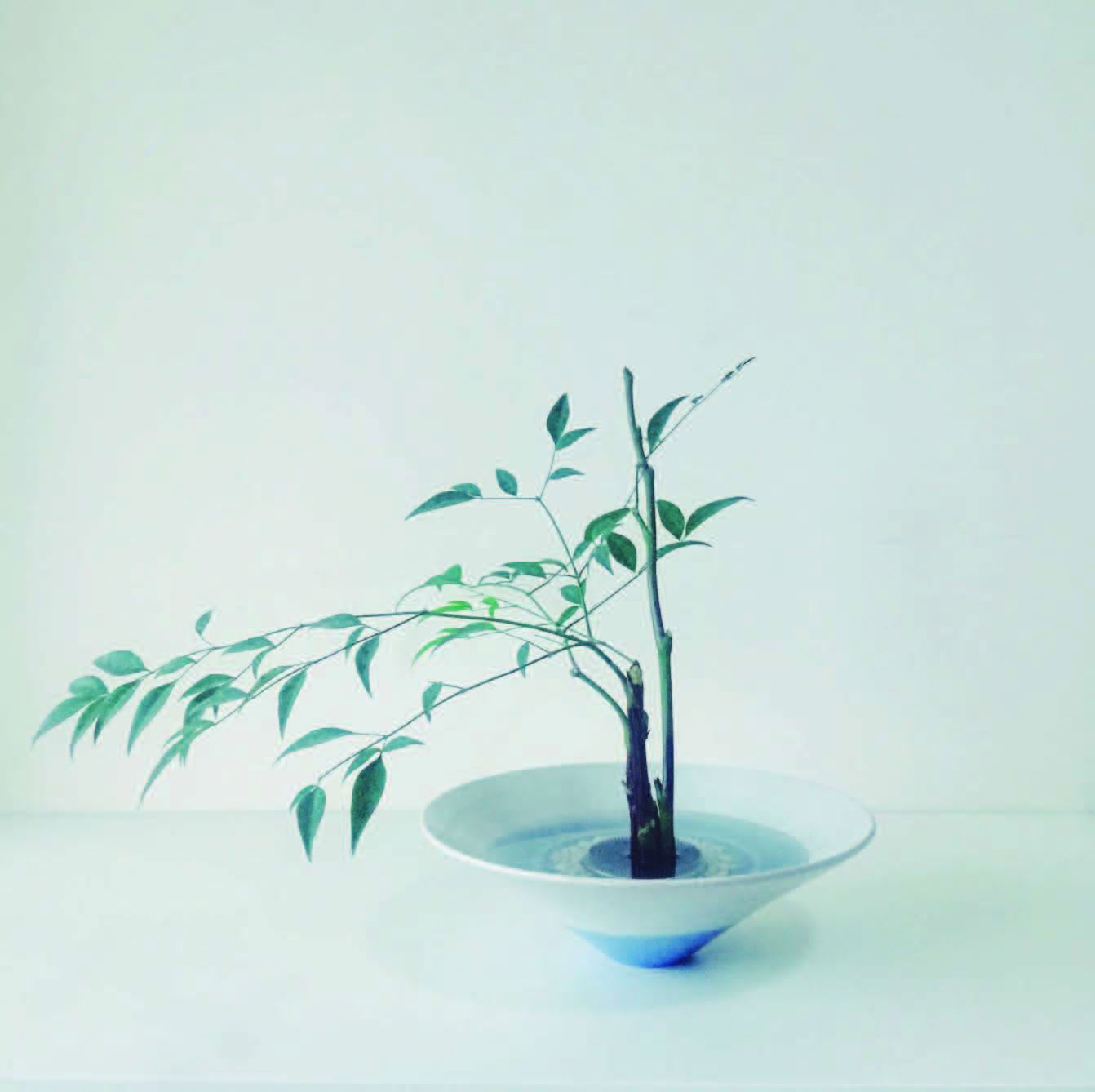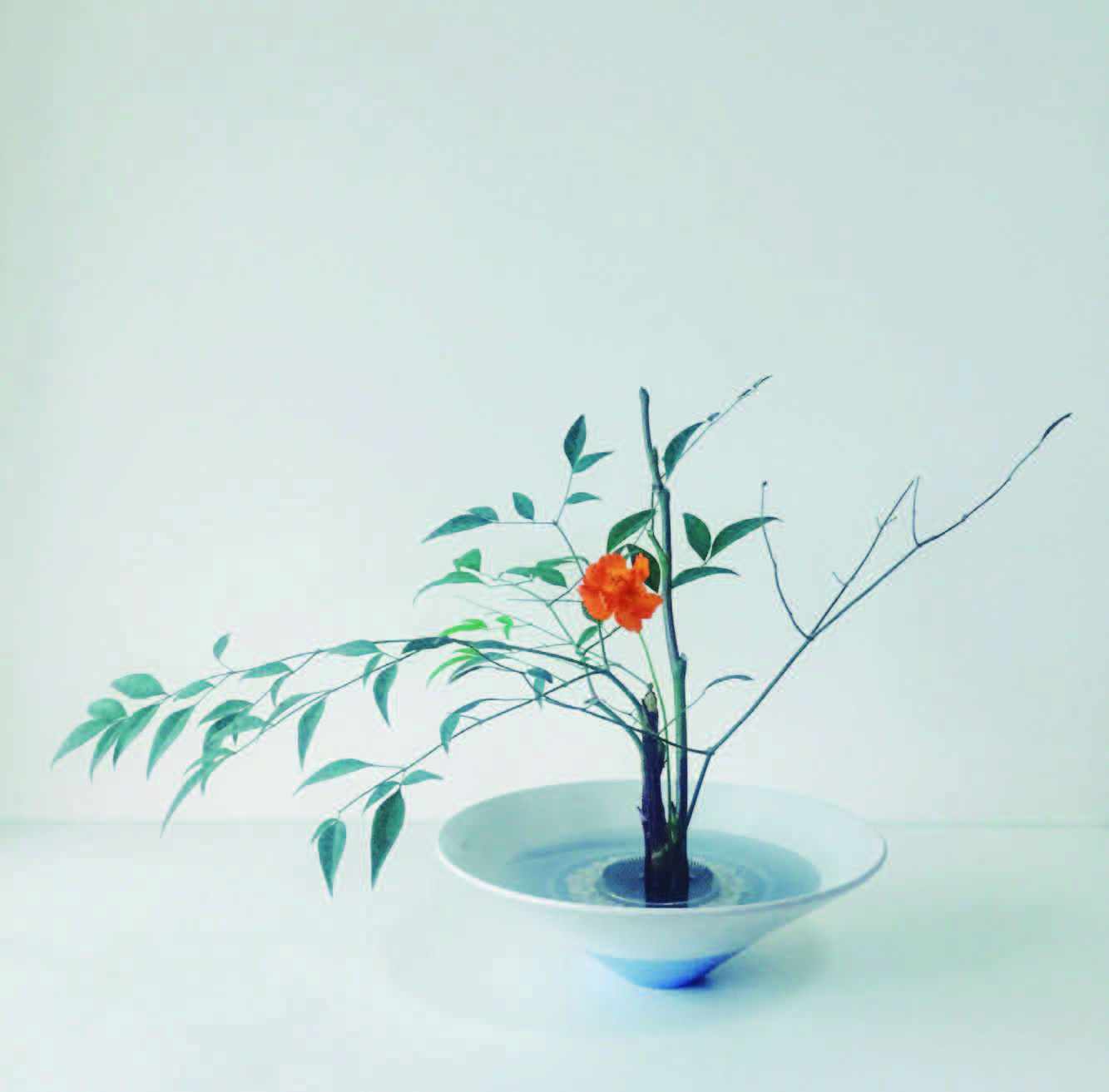 花器里垫好石子,放稳剑山注上水,将一枝粗壮的南天竹修剪干净旁枝,依据个人喜好留下一小枝,插置在剑山右侧1/3处(木本植物请在插口处剪出一个十字切口,否则难以固定在剑山上)。