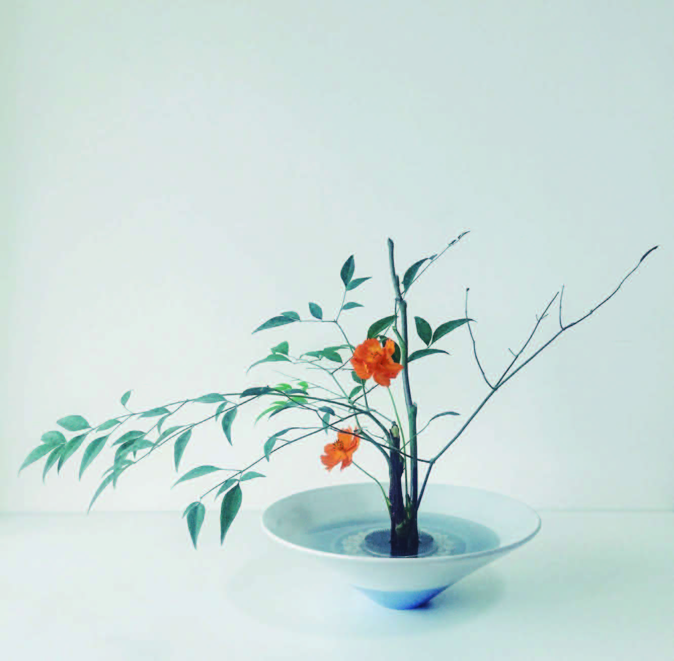 南天竹的空间构架底子打好了。在作品的中心处插上第一枝纤细的橘黄色硫华菊。
