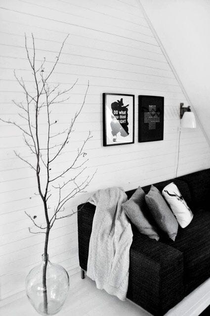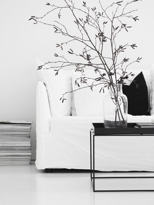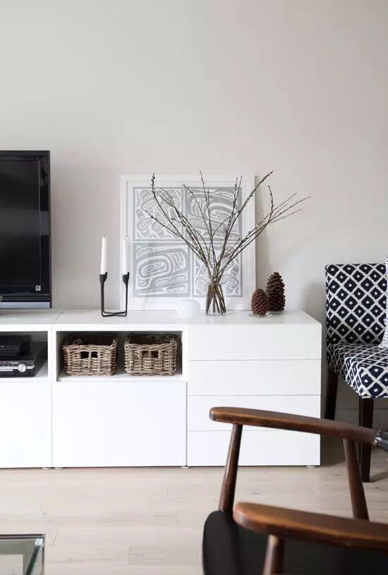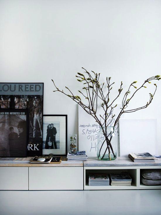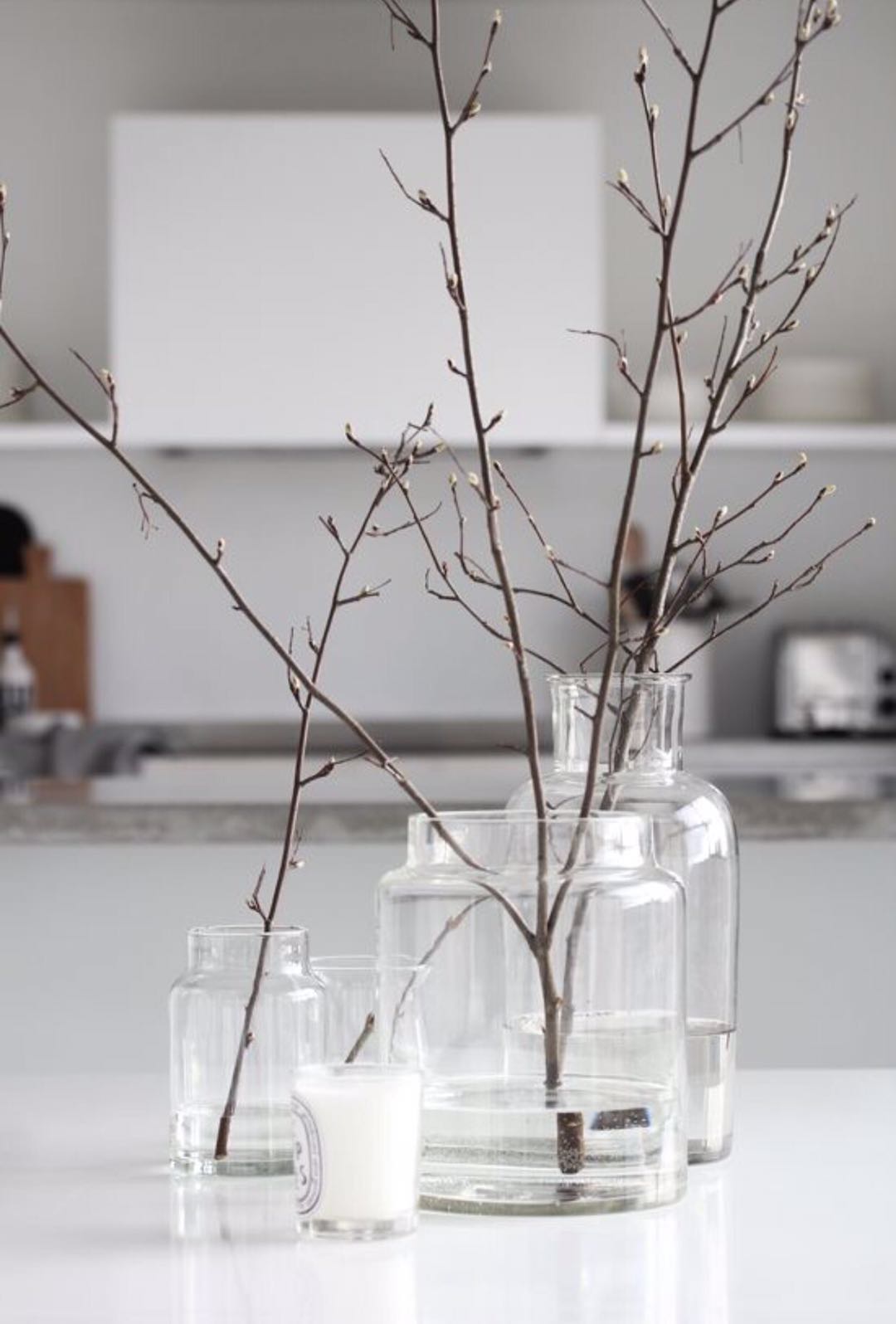 玻璃花瓶给人以澄澈纯净之感,玻璃花瓶搭配树枝的组合非常适合简约风的间距,在整个家居中显得纯净而迷人。