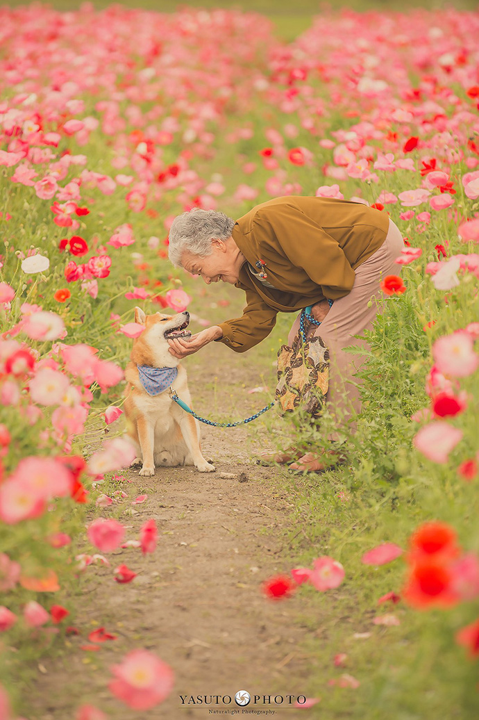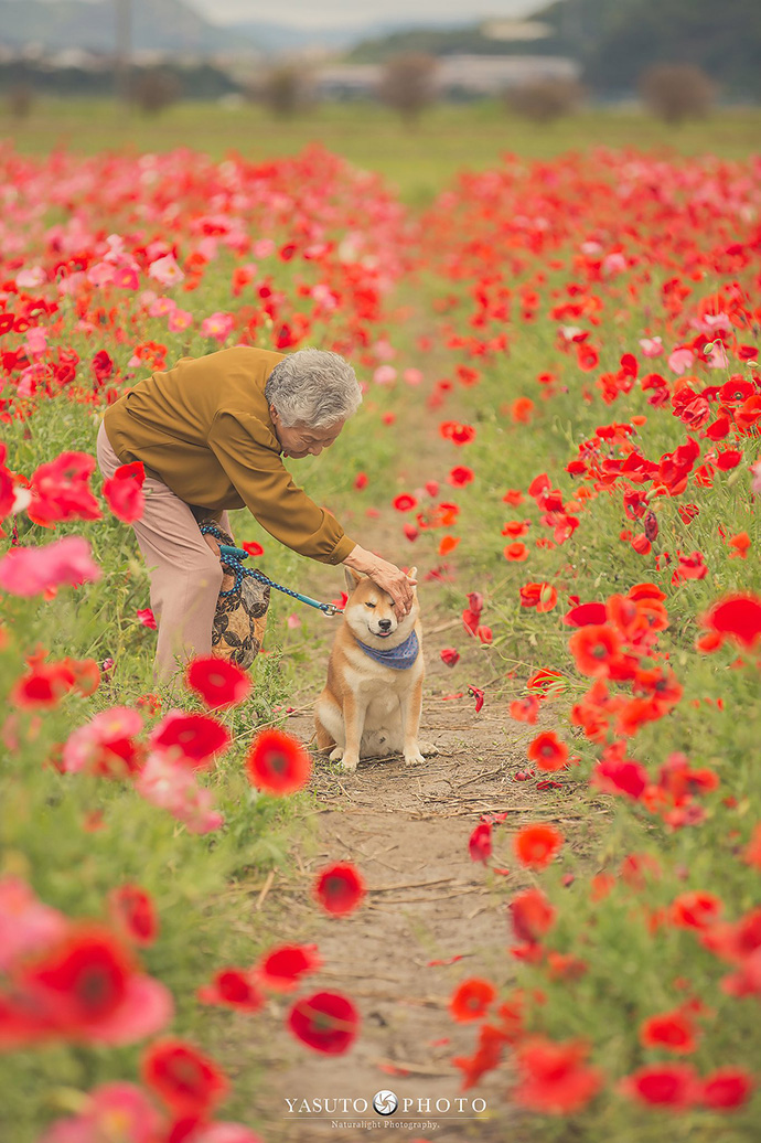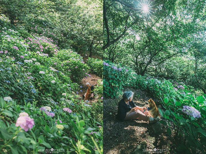 春天里百花盛开,镜头里的祖母置身花海之中,慈祥地看着一只可爱柴犬小福,画面纯真而美好,让人动容。