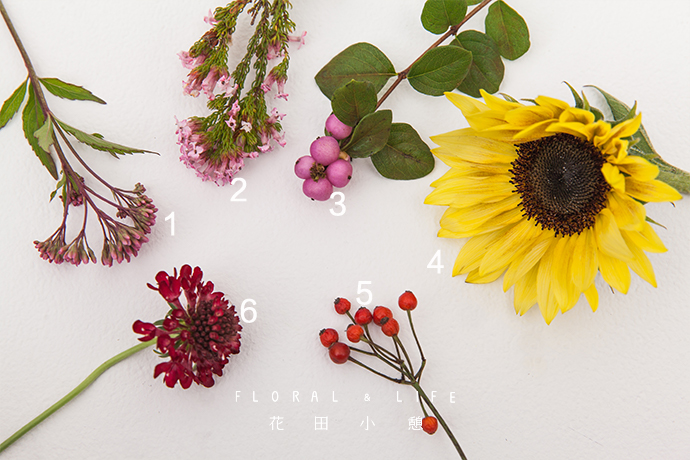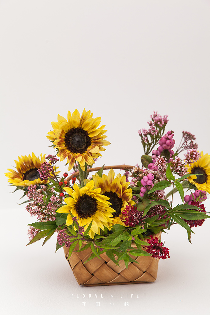 若觉得焦点位置只有向日葵和松虫草略显单调,可用介于向日葵和松虫草花色之间的花材丰富焦点位置,例如雪果和蔷薇果,同时果实类花材也能为作品增加自然美。