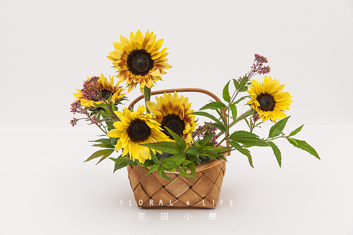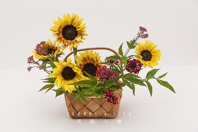 继续用向日葵高低错落插入花泥中,每一朵都仿佛在诉说着秋天的到来。