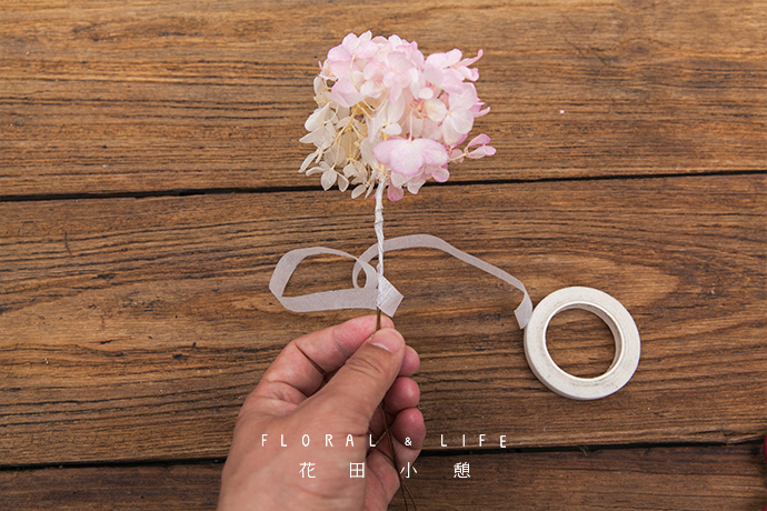 细铁丝裸露在外影响美观,可以在铁丝外围缠绕一圈纸胶带,可以选择与永生花颜色相近的纸胶带。