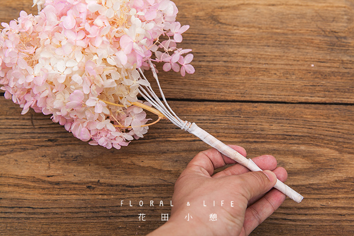将所有剪下的永生绣球花都按照以上方法用纸胶带包好备用。随后可以打包永生绣球花束,和鲜花的打包方法一致,即用螺旋手法包装。注意永生花花头之间的层次感,切勿太紧影响观赏效果。