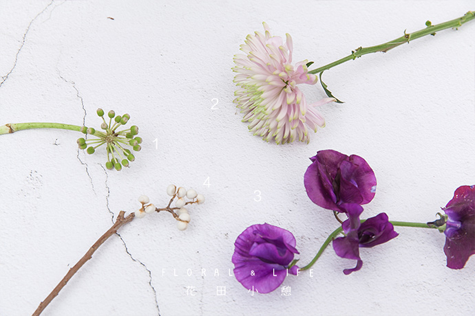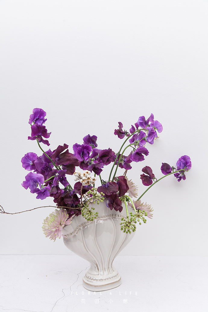 准备几支香豌豆加到作品中。香豌豆花型奇特,枝干细长柔软,可以很好的为作品增添跳跃灵动感。