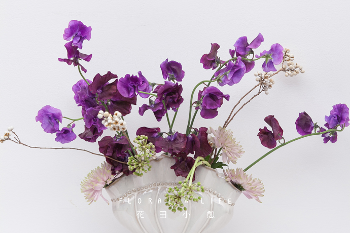 往香豌豆之间加几支乌桕果,演绎出作品不同的层次感。