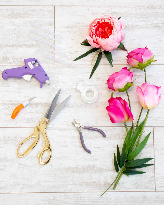Emily Kleinhans各色仿真花、白色油画框、热熔胶枪、钢丝钳、透明胶带、美工刀、剪刀、铅笔、画笔和颜料。