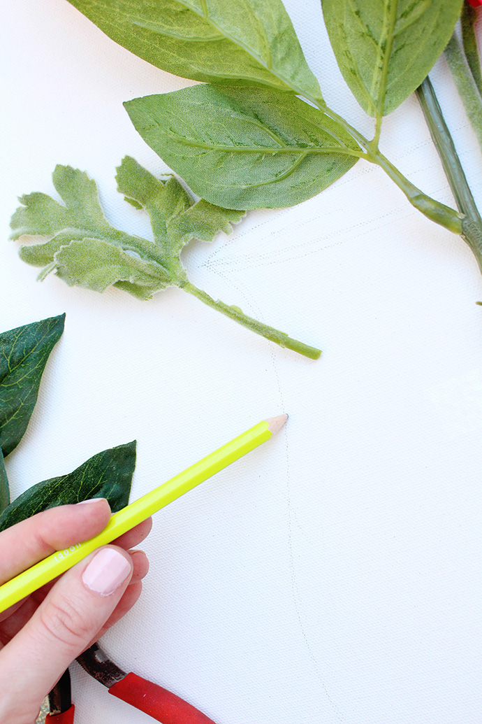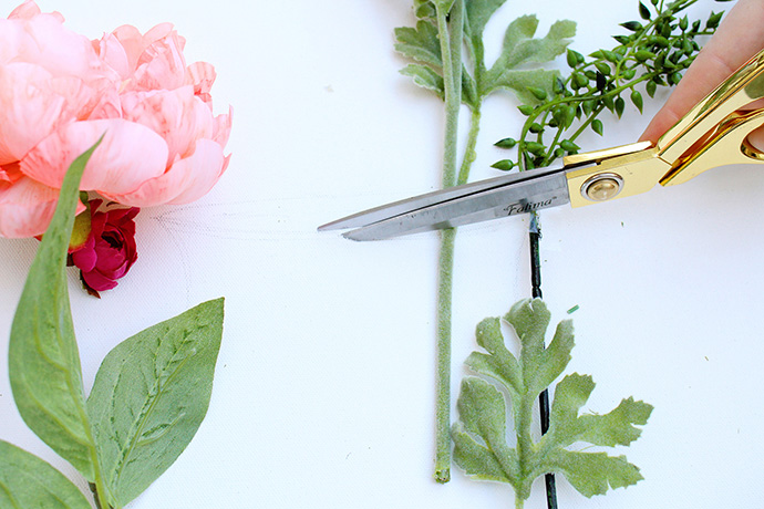 3、用钢丝钳修剪仿真花茎的长度,茎的末端插入缝隙,在画布的背面用透明胶带固定。花朵的部分留在画布正面,就好像插在了花瓶里面。