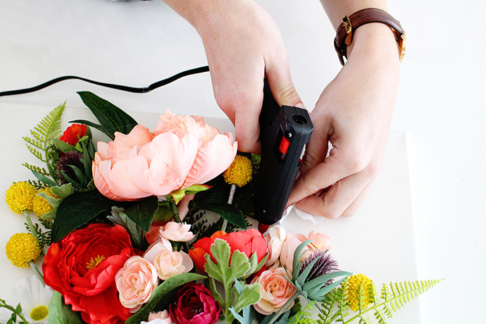 4、在布置仿真花时注意先从大朵的种类开始,逐渐添加略小体型的花朵,最后一些零碎的花材和叶片可以用热熔胶直接黏贴。