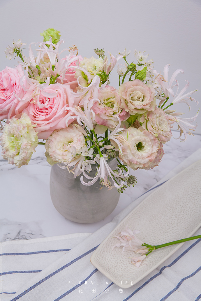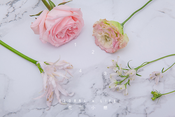在巨浪龙胆和荔枝玫瑰之间添加雾状花材,填充空隙丰富花材。例如小飞燕草,蕾丝等,都是典型的雾状花材。