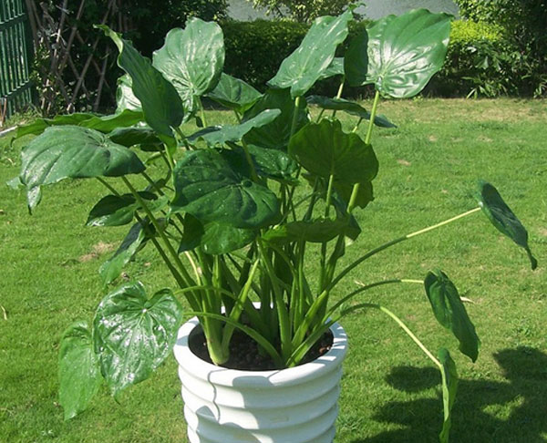 滴水观音,天南星科、海芋属,又名滴水莲、观音莲,佛手莲等,台湾地区称姑婆芋,原产南美洲,为热带和亚热带常见观赏植物,俗称痕芋头、狼毒(广东)、野芋头、山芋头、大根芋、大虫芋、天芋、天蒙等,作为观赏植物时则称其为滴水观音。多年生常绿草本植物,有药用价值,球茎和叶可以药用,但有毒,其叶汁入口会中毒。在温暖潮湿、土壤水分充足的条件下,便会从叶尖端或叶边缘向下滴水,而且开的花像观音,因此称为滴水观音。