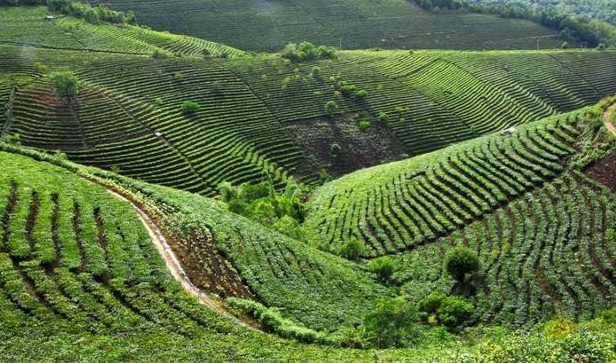 台地茶是指成片种植、人工矮化、精工管理的现代茶园茶。由于受人为种植、采摘、修剪刺激的影响,这类茶树主千不明显,一级分枝部位变低。在种植密度较大吋,树体个体生育空间较小,茶青芽叶细小、叶质较薄、条形较为秀丽,这些特点在长期采摘的密植茶园里尤为明显。台地茶口感没有野生茶浓郁,但也可能因密植而虫害略多的原因,使得台地茶苦涩味比较重,香气高锐,口感刺激性强。