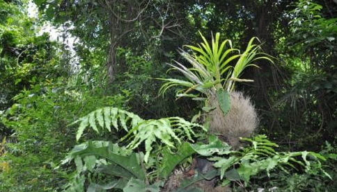在热带雨林中,植物生长茂密,由于植物之间争夺阳光的竞争比较激烈,附生的植物就更容易获取来之不易的光源。附生植物在形态和生理上,已形成非常适应的特性,比如鸟巢蕨的形态似鸟巢状,可以截留尽量多的雨水以及枯落物、鸟粪等,海绵状的枯落物可储存水分,并提供营养物质。