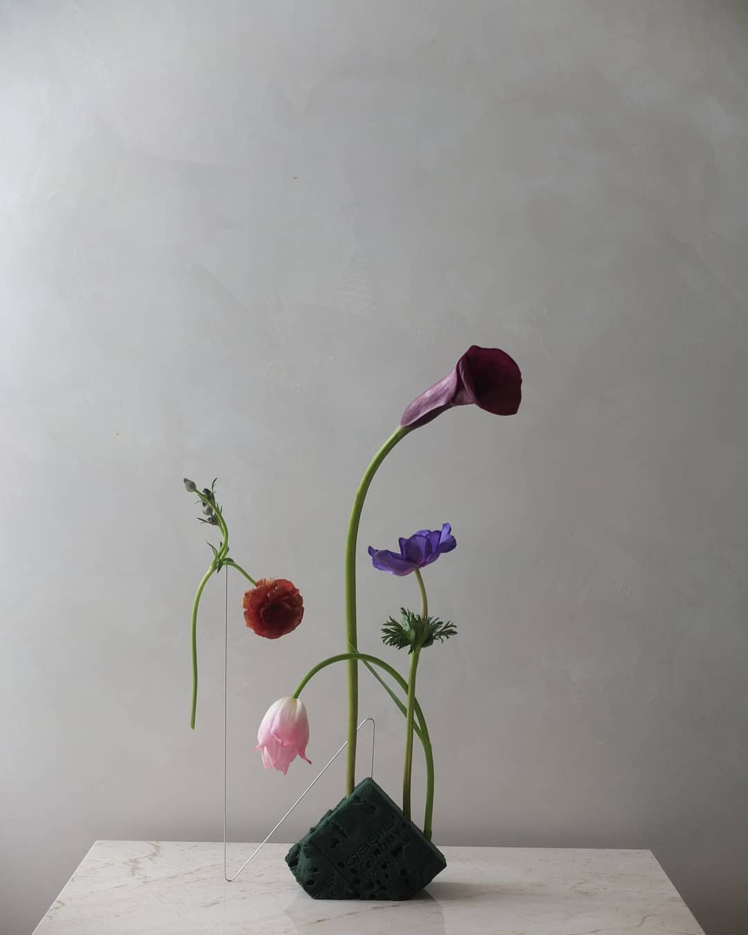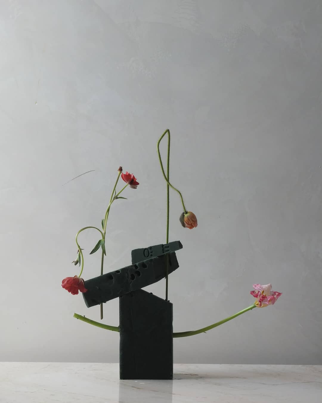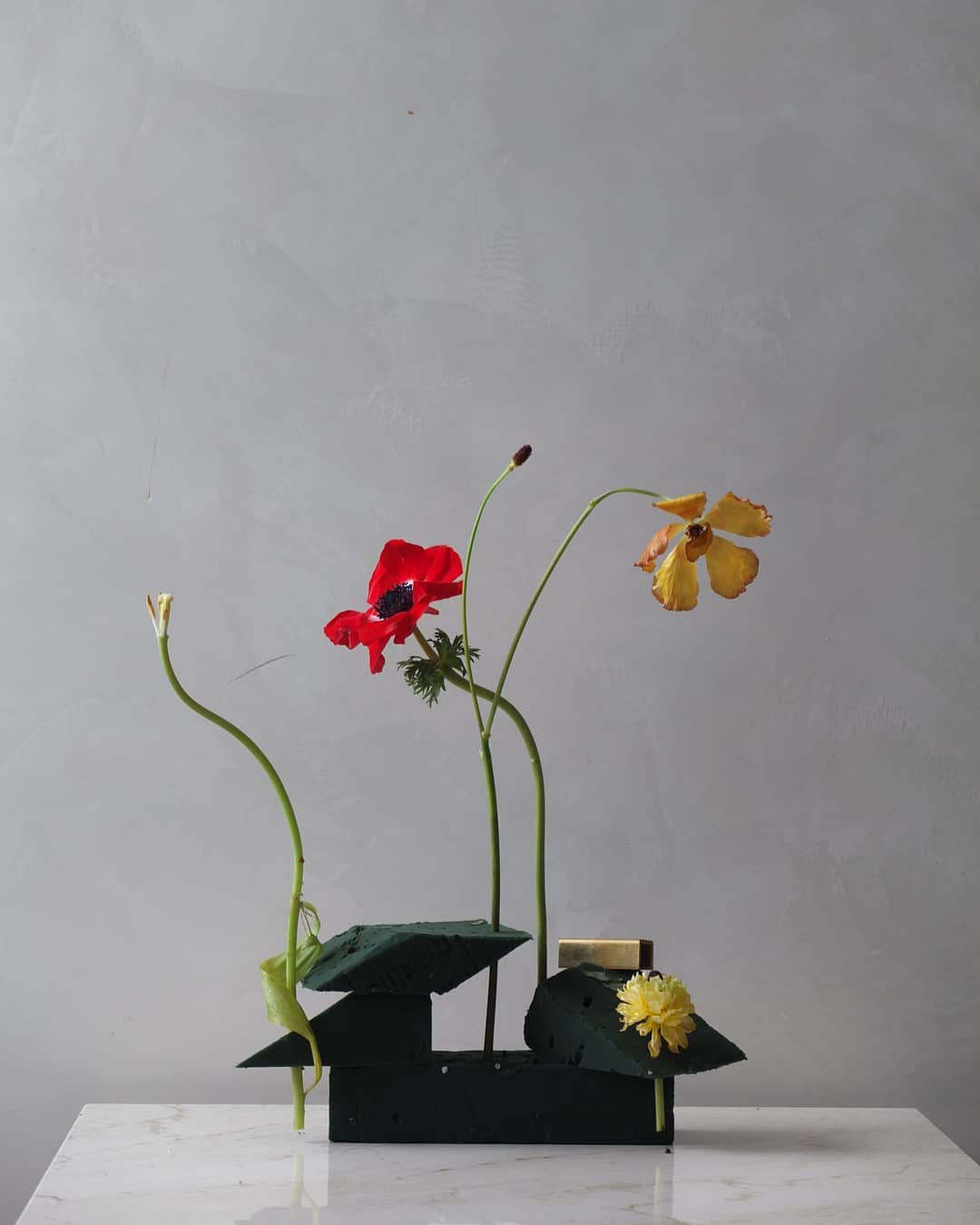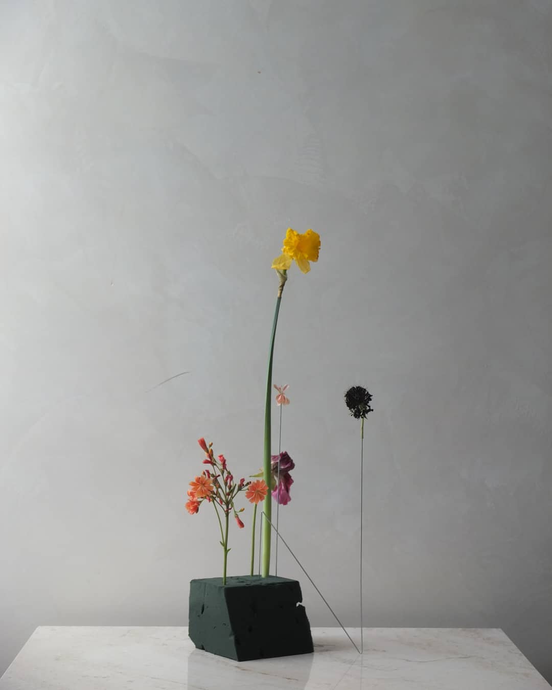 用废弃花泥插制花艺作品其实并不难,无需花器,也无需太多的花材。几根铁丝,几支花材,折断的花材也无所谓,很是原始自然,越看越有味道。