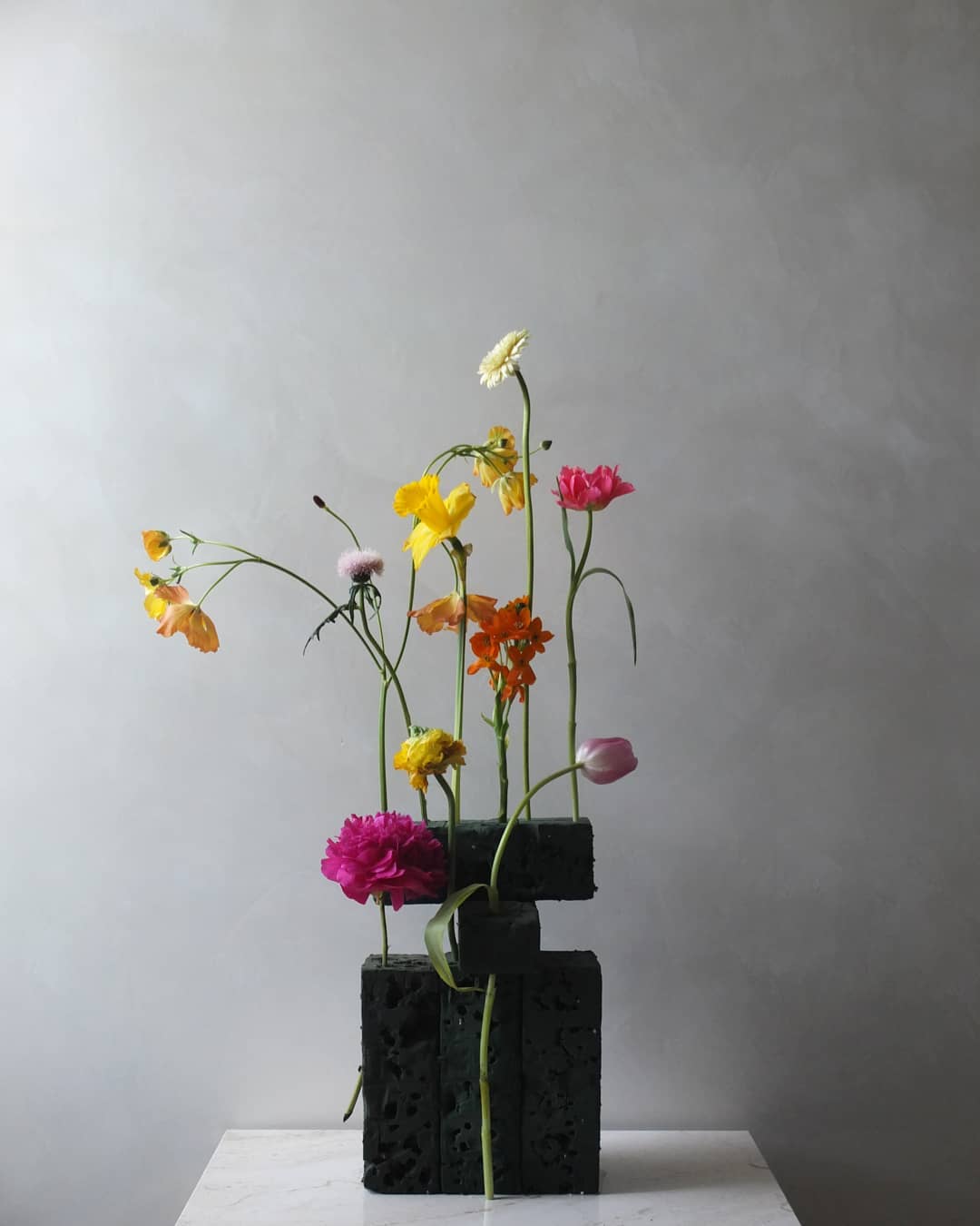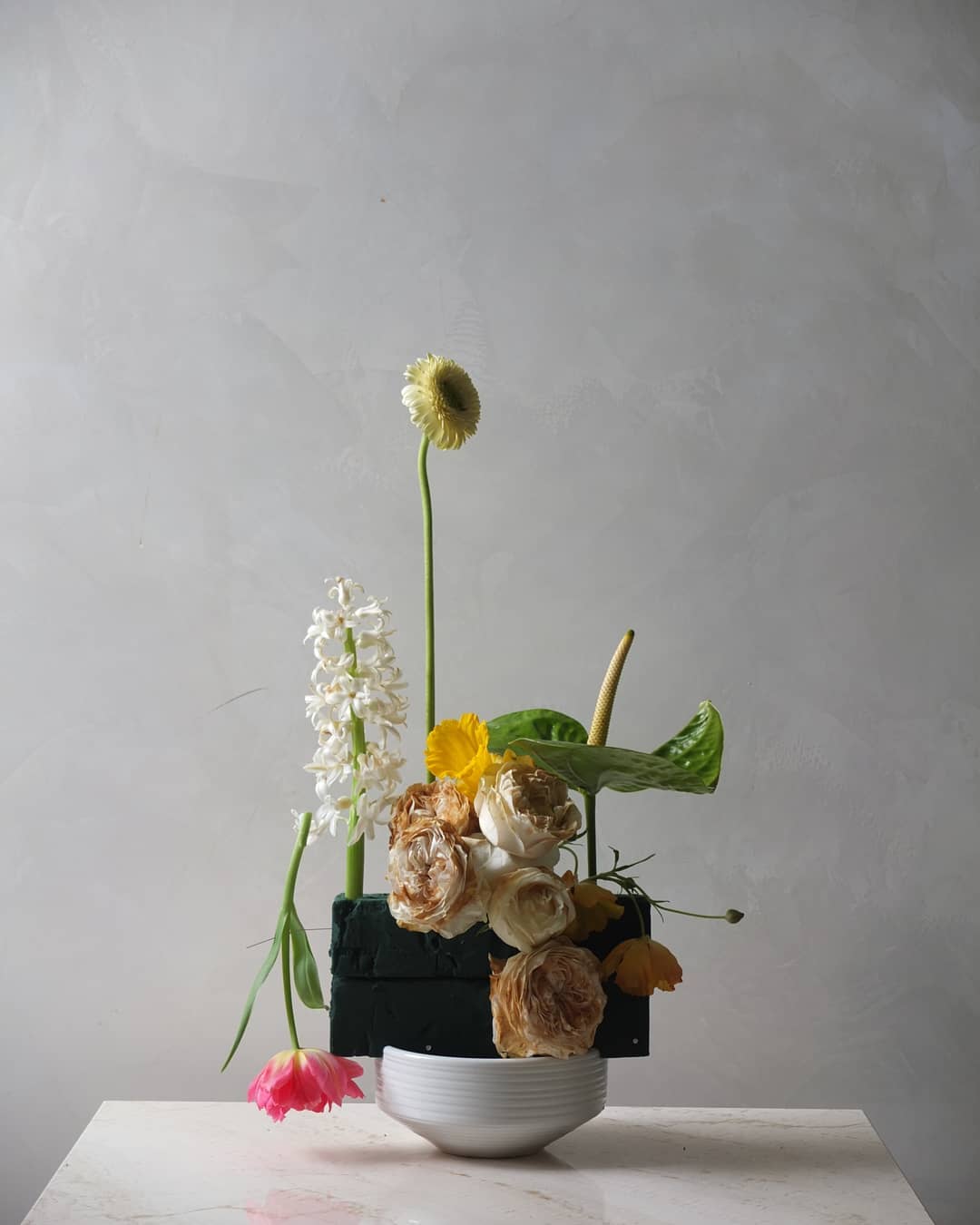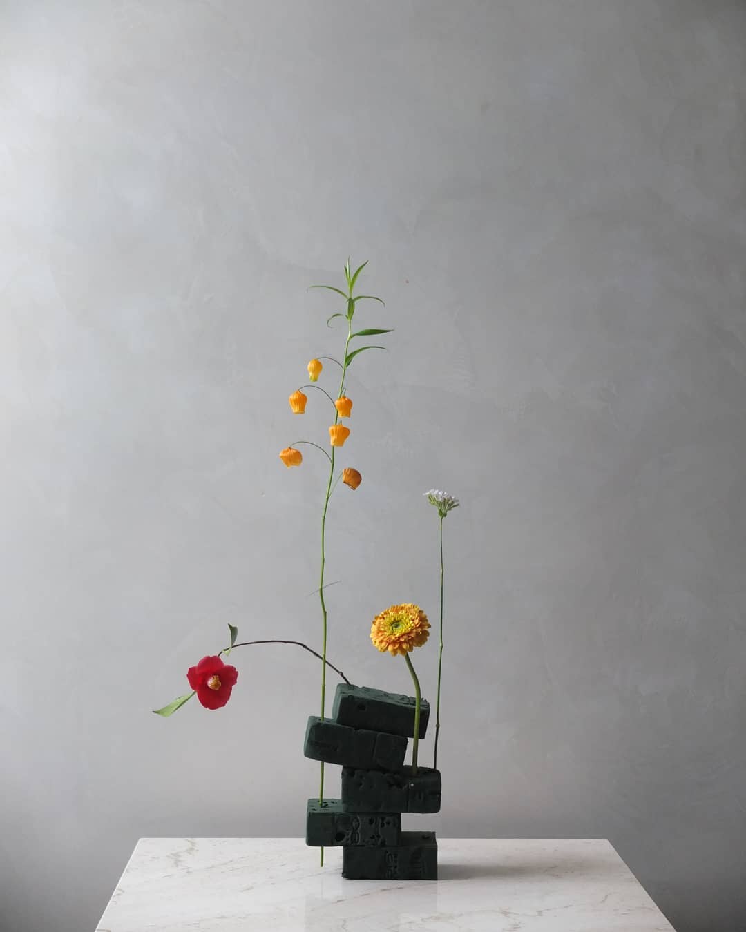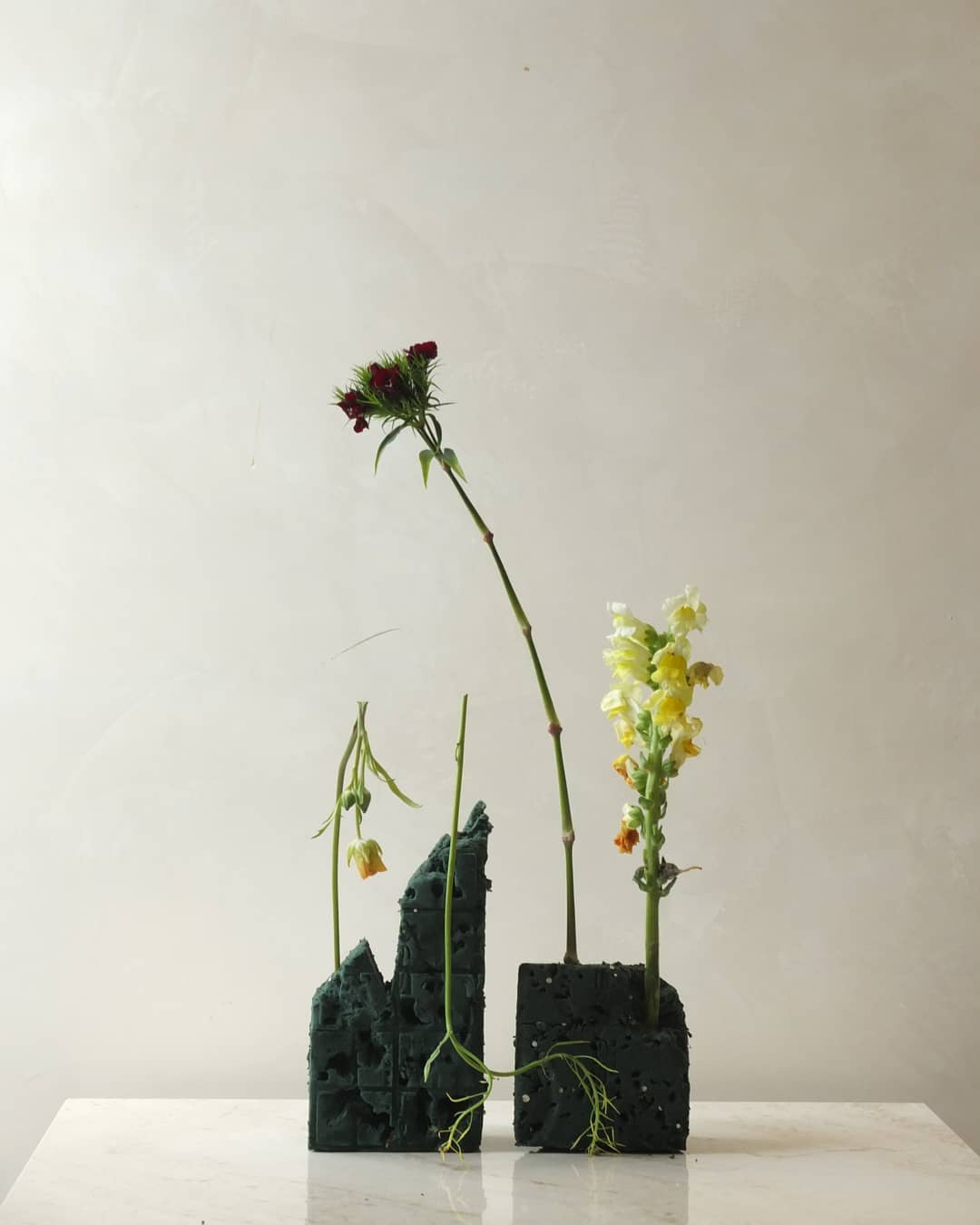 用废弃花泥插制花艺作品其实并不难,无需花器,也无需太多的花材。几根铁丝,几支花材,折断的花材也无所谓,很是原始自然,越看越有味道。