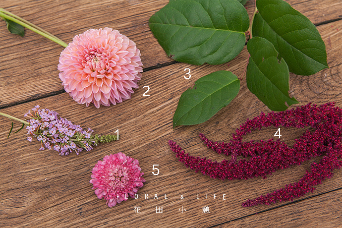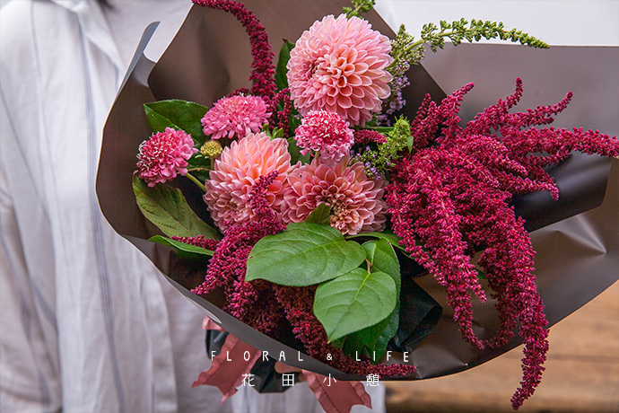 用不同质感的花材做出的花束,给人的感觉也很特别。小丽花的质感让人温暖、可亲近,苋菜花的气质则更符合女生的气质,给人优雅的感觉。