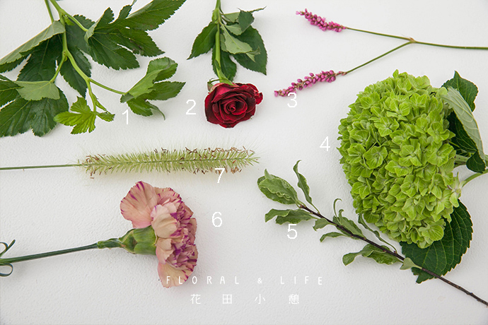 本期花束选用绣球作主花材,选一支花型饱满、花茎直立的绣球握在手心位置。