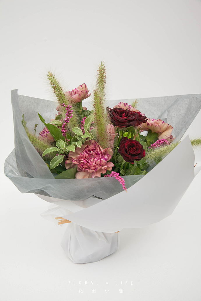 最后用白色雾面纸包裹花束,用拉菲草做最后的装饰,这也能体现小小绳结的存在感,而且白色的包装纸更显亲切。有“田园小筑话桑麻”之感。