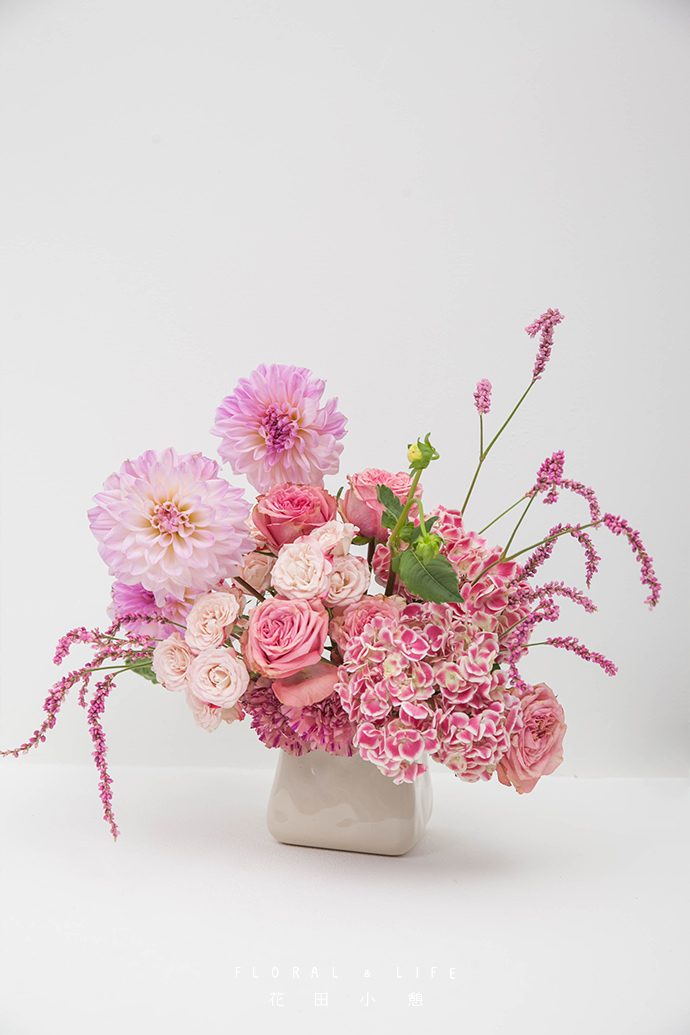 此时作品的基础轮廓已经打好,用康乃馨铺底插制,能有效地遮盖花泥。左侧位置用大丽花丰富,交错插制,更显作品的品质感和空间感。