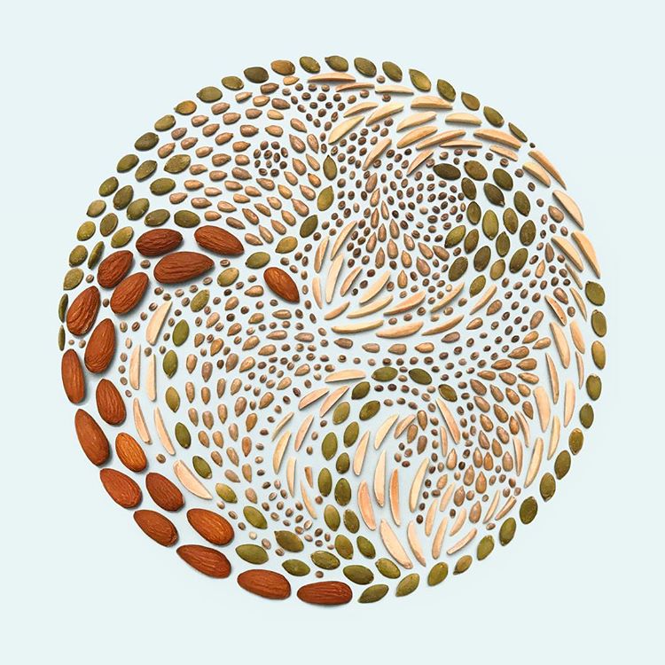 她还经常将花瓣、木棍、食物、药草和其他常见的原材料排列成圆形和正方形。这些技巧来自于她对负空间的运用,创造了隐含的边界线,帮助她在物体没有完整密度的“成分”的情况下完成形状。
