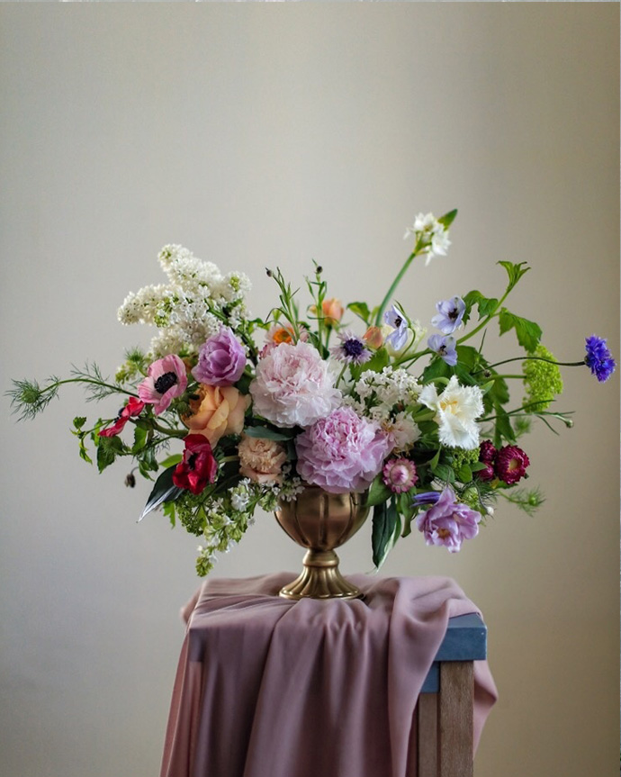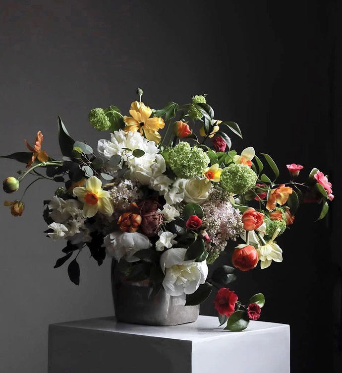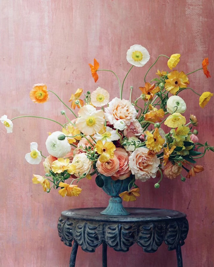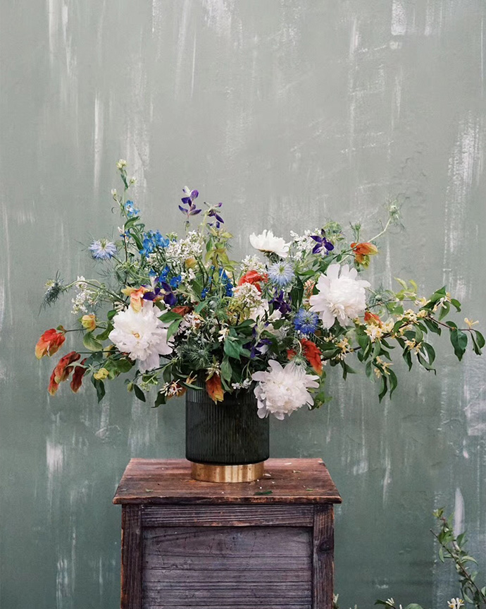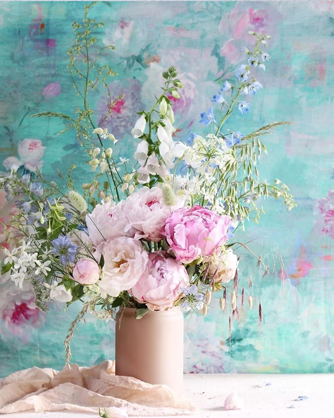 2、使用与花艺作品为同类色的背景拍摄。