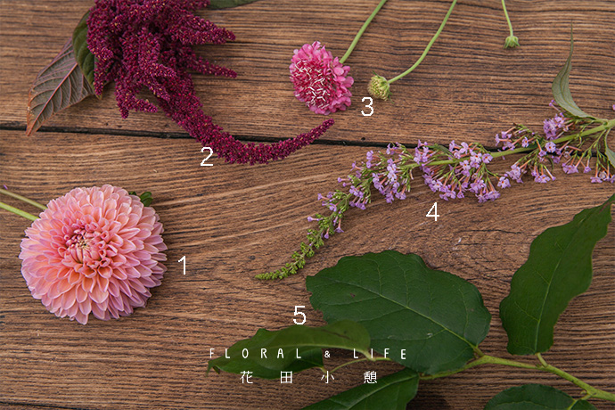 这时候,可以用小丽花和苋菜花的邻近色花材丰富两者之间的空隙,例如蓝盆花。