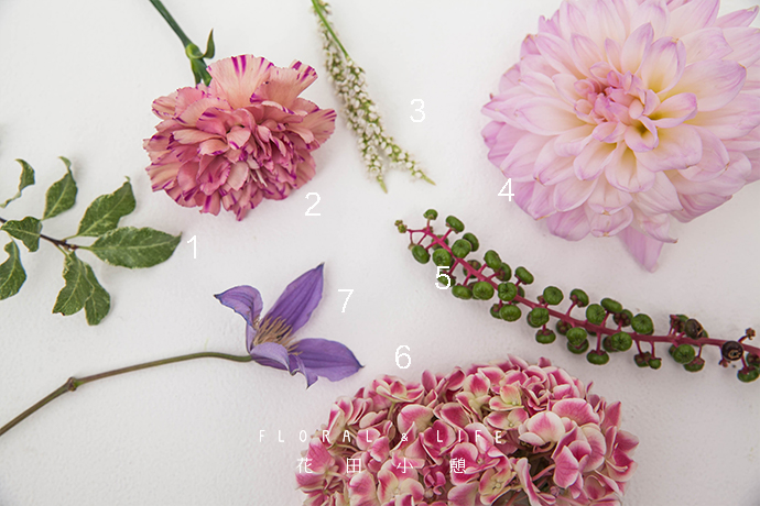 之后在绣球和多头玫瑰中间的空隙处添加几支康乃馨。
