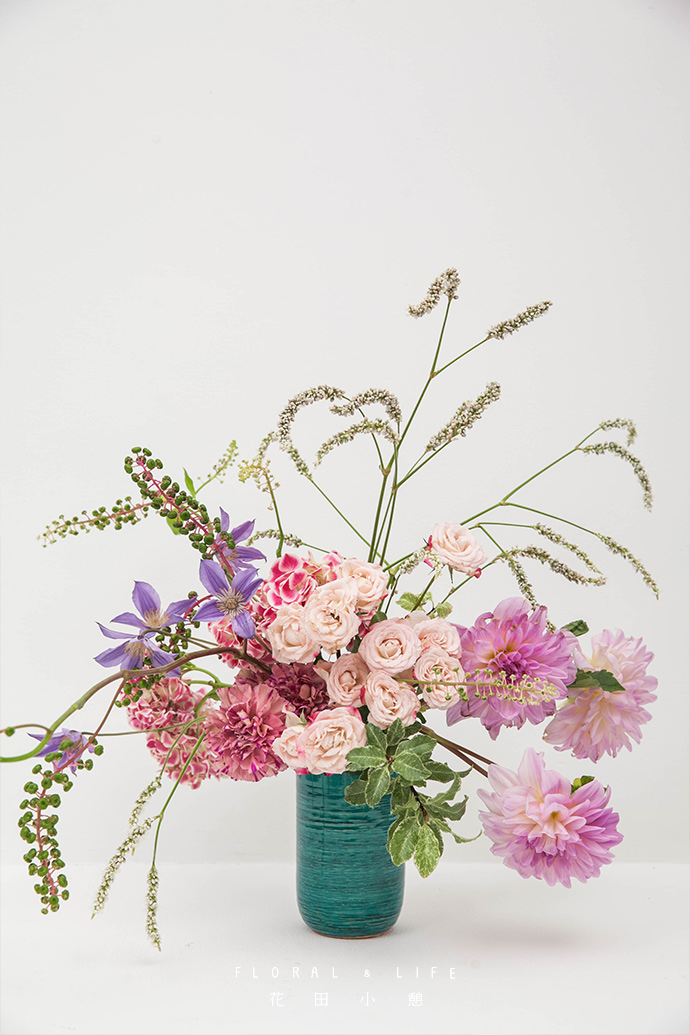 继续用商陆和大丽花确定作品的空间维度,可以让花穗自然下垂,为作品增添律动感。大丽花体量较大所以插入时要短而密,而商陆体量小所以长而松散,这样可以使整个作品的花材体量保持平衡。