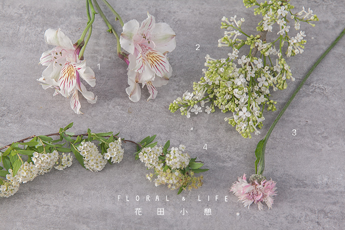 在小手球和丁香中间加入水仙百合和矢车菊,这时候就能体会到小手球的另一个作用,可以靠它们固定花朵的位置。水仙百合除了大面积白色外,还有点点紫粉,与矢车菊颜色相呼应,丰富作品色彩层次。而拥有特别花型的矢车菊,能为作品增添高品质感。