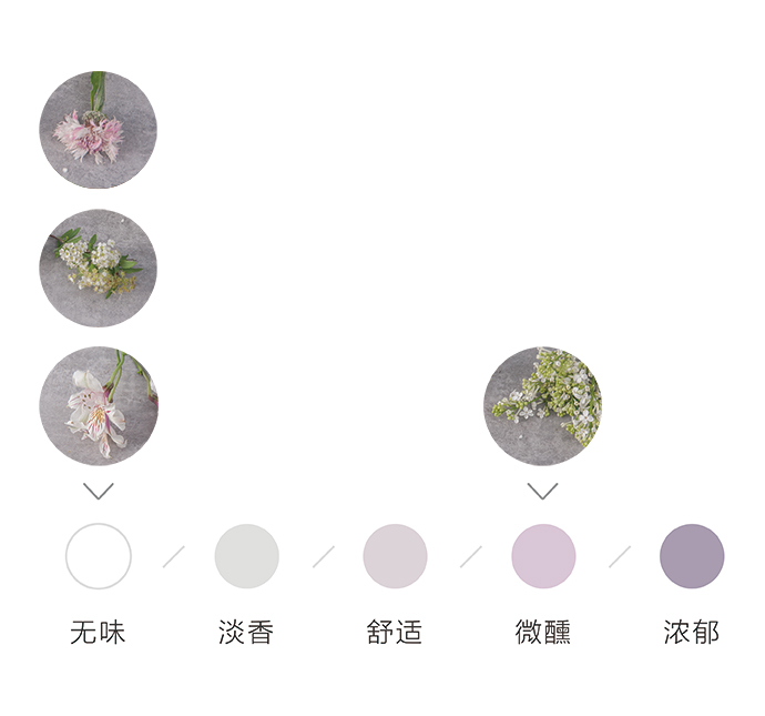 为了方便大家在花材搭配时的选择,花田小憩APP特设香味等级图谱,供大家在学习过程中了解更多植物的属性,以方便作品选择更适合的空间位置陈列。