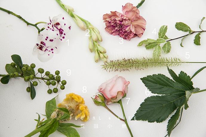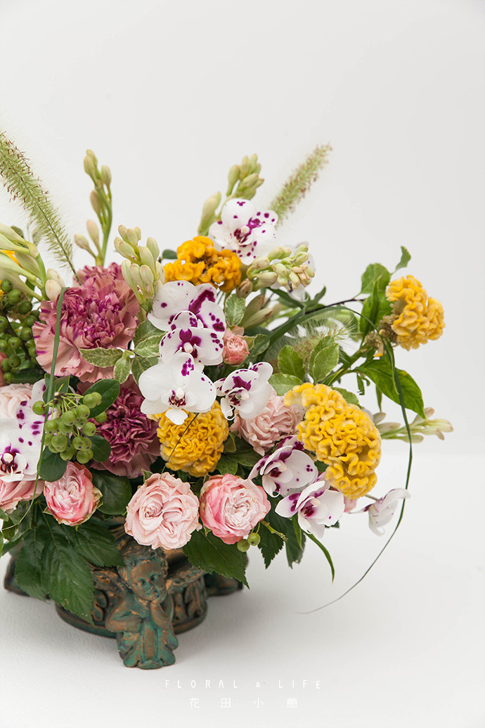 最后用蝴蝶兰和毛毛草为作品做统一的装饰,花朵恣意生长,各有味道却十分协调。冰激凌色系的花朵描绘季节的温柔变换。