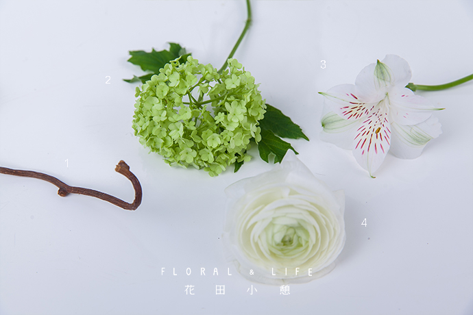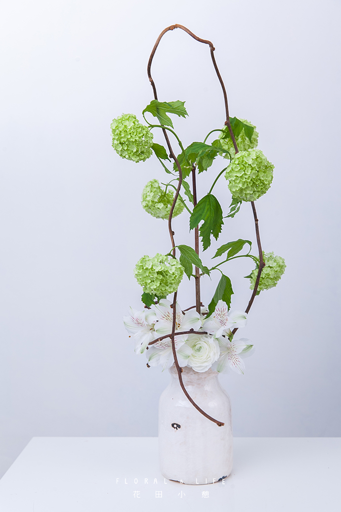 作品底部空间由洋牡丹、水仙百合、猕猴桃藤三种花材完成作品支撑。视觉主体木绣球与底部的白色形成鲜明对比。两处猕猴桃藤也相互呼应,以精简的花材,构筑富于美感的结构。