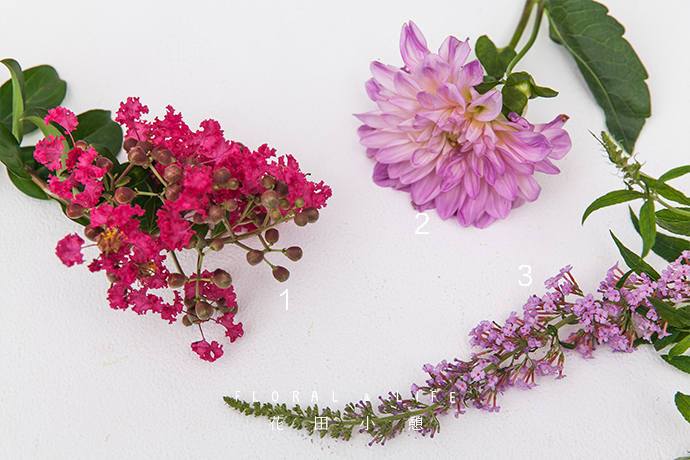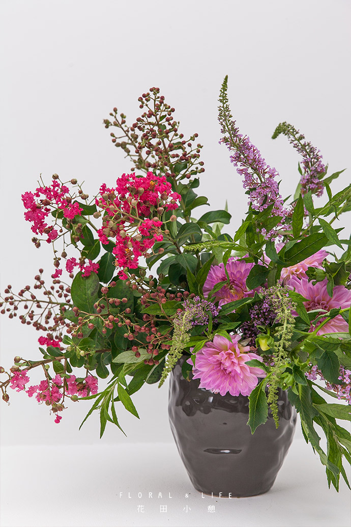 最后统一调整各个花材,力求作品完美,大丽花在紫薇和醉鱼草中含苞待放,虽然作品只用了三种鲜花,却也达到了繁盛的效果。