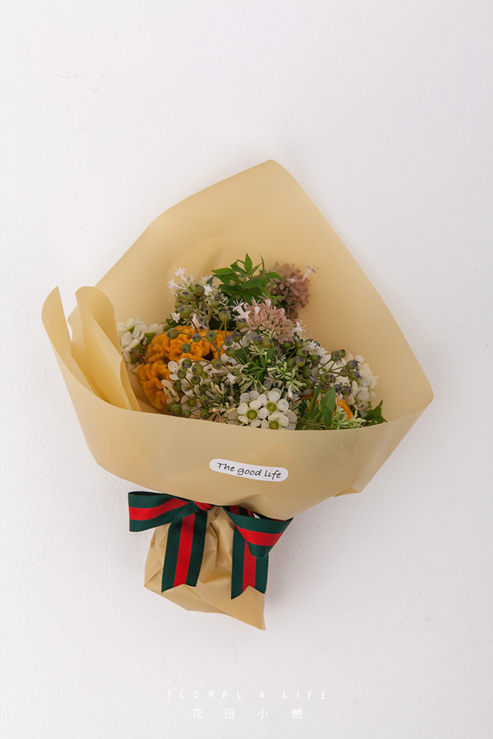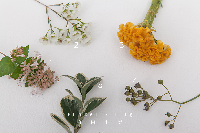 在鸡冠花周围添加一些泽兰花,这时不要将花束捏的太紧,泽兰也可以为后续的花材做缓冲。