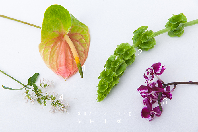 以中心位置的贝壳草为基准,在其四周各插几枝丁香,因为贝壳草和丁香都是线条状花材,在这一步就需要调整出作品大致的样子。