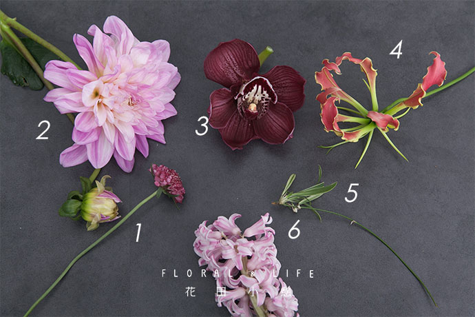 为了方便大家在花材搭配时的选择,花田小憩特设香味等级图谱,供大家在学习过程中了解更多植物的属性,以方便作品选择更适合的空间位置陈列。向花器中注入清水,在最高的瓶口中插入大丽花1支。
