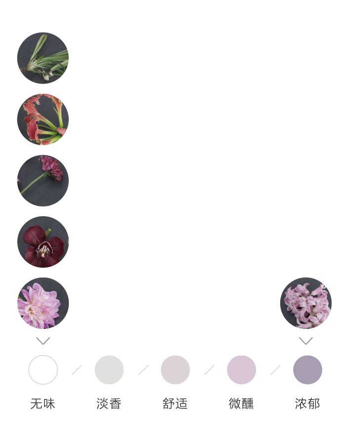 为了方便大家在花材搭配时的选择,花田小憩特设香味等级图谱,供大家在学习过程中了解更多植物的属性,以方便作品选择更适合的空间位置陈列。