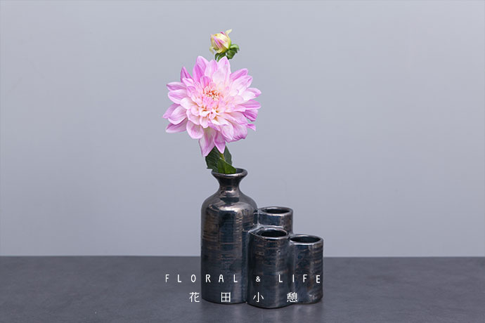 向花器中注入清水,在最高的瓶口中插入大丽花1支。