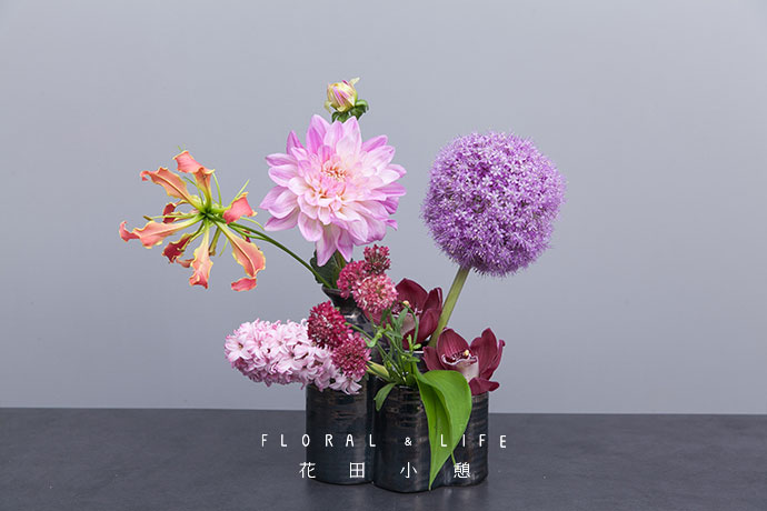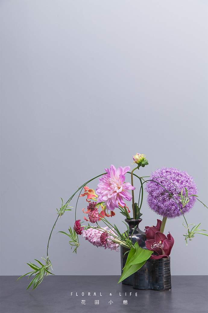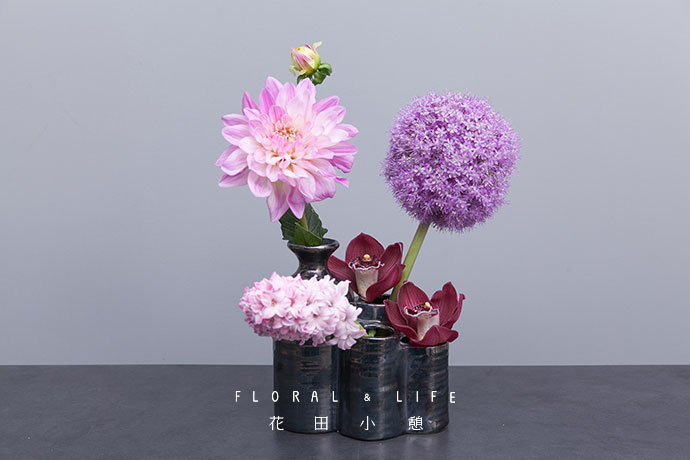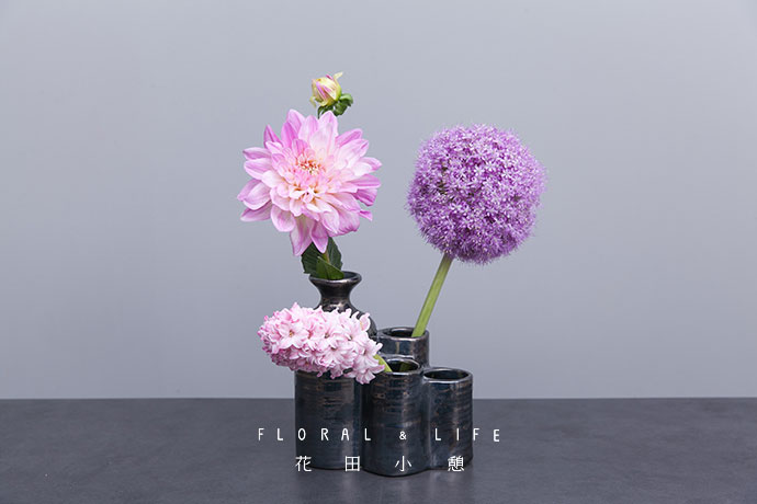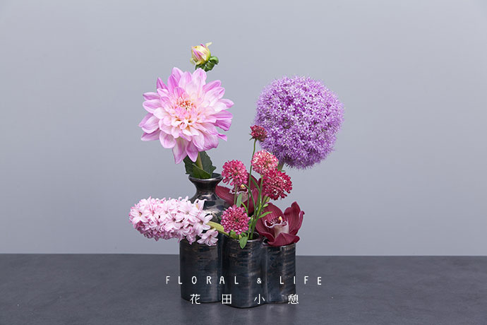 分别在另外两个较低的瓶口种插入葱花和风信子,粉与紫相搭营造出温柔浪漫的美感。