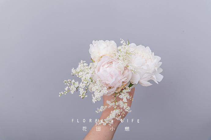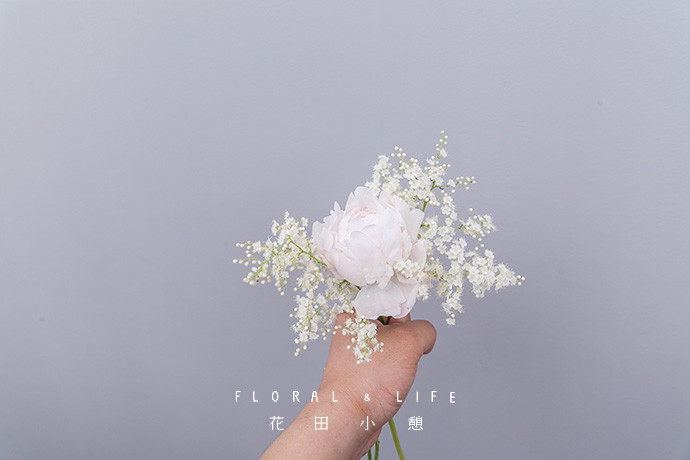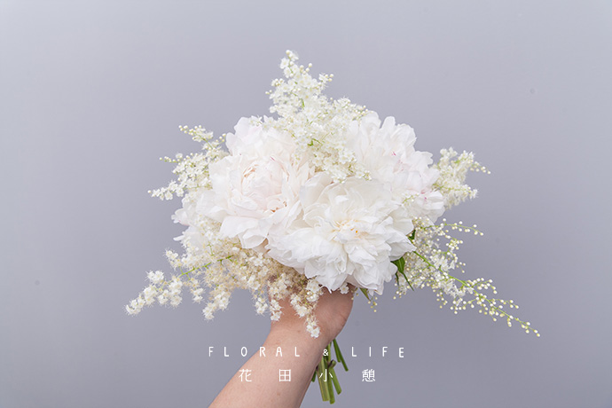 将剩余花材加入捧花中,珍珠梅高于芍药,展现其美丽的姿态,营造空气感。
